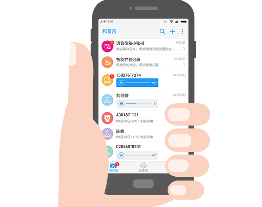 当您手机漏接电话、主动关机、电话占线时,来电转入语音信箱。对方可以给你留言。